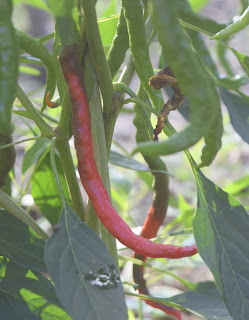 いつもの日曜日だと、朝7時すぎに家を出て夏井川渓谷の隠居で土いじりをする。今週は新盆回りがある。早朝6時前、隠居へ車を飛ばした。キュウリや赤くなったトウガラシ=写真=を収穫し、三春ネギの苗を間引きした。生ごみを埋め、草引きをして、8時前には帰宅した。